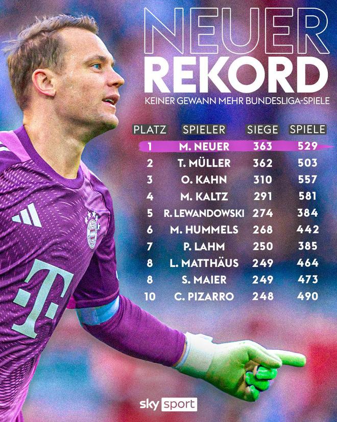 镭速体育10月19日讯 在德甲第7轮德国国家德比中,拜仁2-1击败多特蒙德,取得新赛季德甲7连胜、各项赛事11连胜。此役过后,39岁的德国门将诺伊尔以363场德甲胜场超越前队友穆勒,成为德甲胜场榜首。自2005年诺伊尔正式开始一线队生涯以来,他已代表沙尔克04和拜仁慕尼黑出战529场德甲比赛,取得了其中的363场胜利。他超越了前搭档托马斯·穆勒的纪录(503场比赛,362场胜利),加冕德甲历史上获胜场次最多的球员。在他身后的其他球员包括卡恩(557场比赛中310场胜利)、曼弗雷德·卡尔茨(581场比赛中291场胜利)、莱万多夫斯基(384场比赛中274场胜利)、胡梅尔斯(442场比赛中268场胜利)、拉姆(385场比赛中250场胜利)、马特乌·塞雷(464场比赛中249场胜利)、塞普·迈耶(249场主场)获胜 ( 473 场比赛)和皮萨罗(24 场比赛)490 场比赛中取得 8 场胜利)。在这份名单中,只有诺伊尔在德甲踢球。他仍然希望能够继续刷新自己所保持的纪录。
